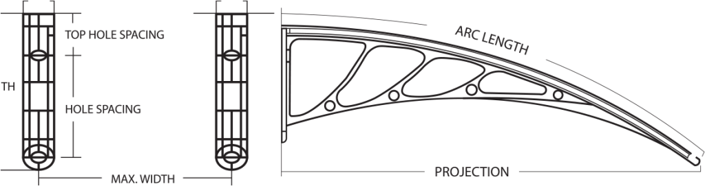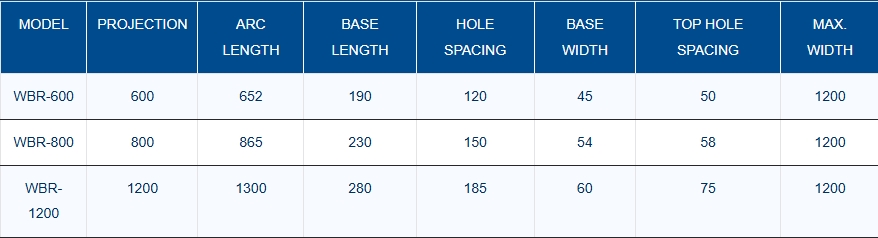 MODELPROJECTIONARC LENGTHBASE LENGTHHOLE SPACINGBASE WIDTHTOP HOLE SPACINGMAX. WIDTH